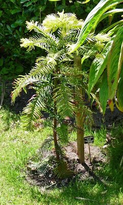 I read about this tree - The Wollemi Pine - one of the oldest known trees, there are believed to be less than 100 adult trees in the world. Here in the garden of Polreath tea garden it seems to be doing well.