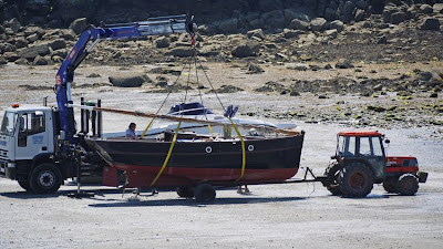 John & Kay's lovely looking boat being lifted off the trailer & put on the beach