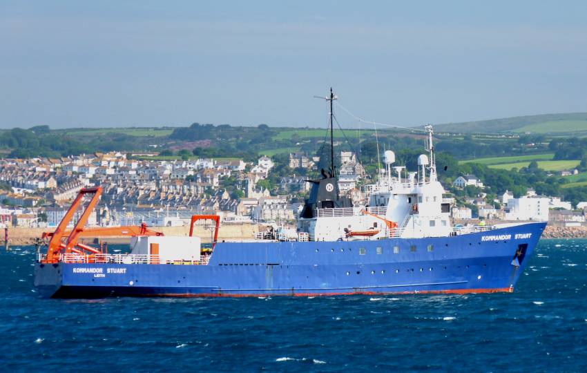 As we were leaving home to set off on holiday, I noticed this vessel arriving in Mounts Bay and we then passed close by her. She is the fishing vessel Kommandor Stuart all the way from Leith. Much larger than any we normally see in Newlyn.Unfortunately Charlie is not happy on deck, so no more photo until St Mary's