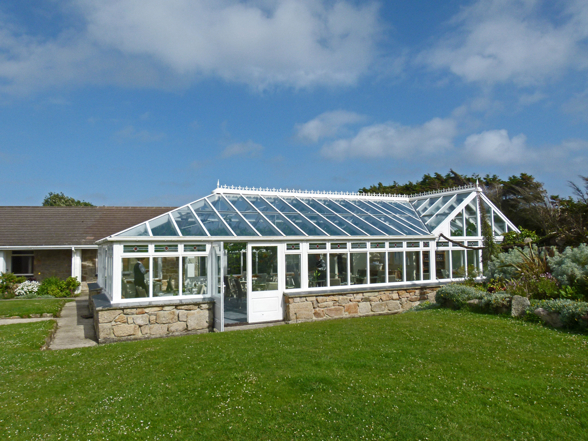 For those who haven't seen it, this is the large conservatory where we have most of our meals at the Star Castle. Since there are more guests than can be accommodated in the Castle Dining Room (which serves mainly meat dishes and is a little more formal) they serve mainly fish in the conservatory under the ripening grapes on the massive vine which enters to the right and covers the whole ceiling. A lovely spot both for breakfast and dinner.